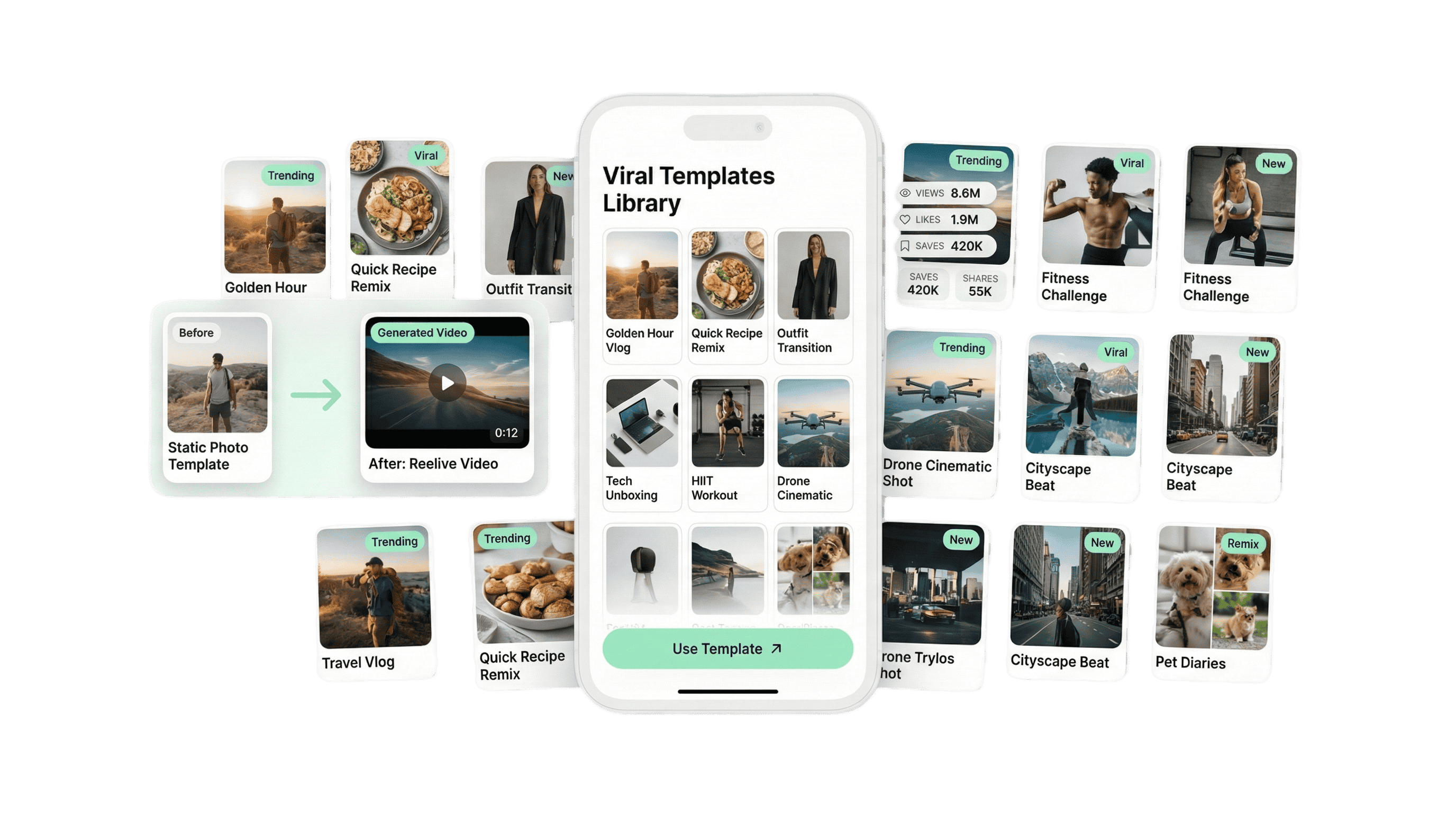 无需从零开始——即刻复制热门风格。Reelive AI 提供爆款模板库,让你一键创作「同款」视频。轻松乘上社交媒体潮流的浪尖。